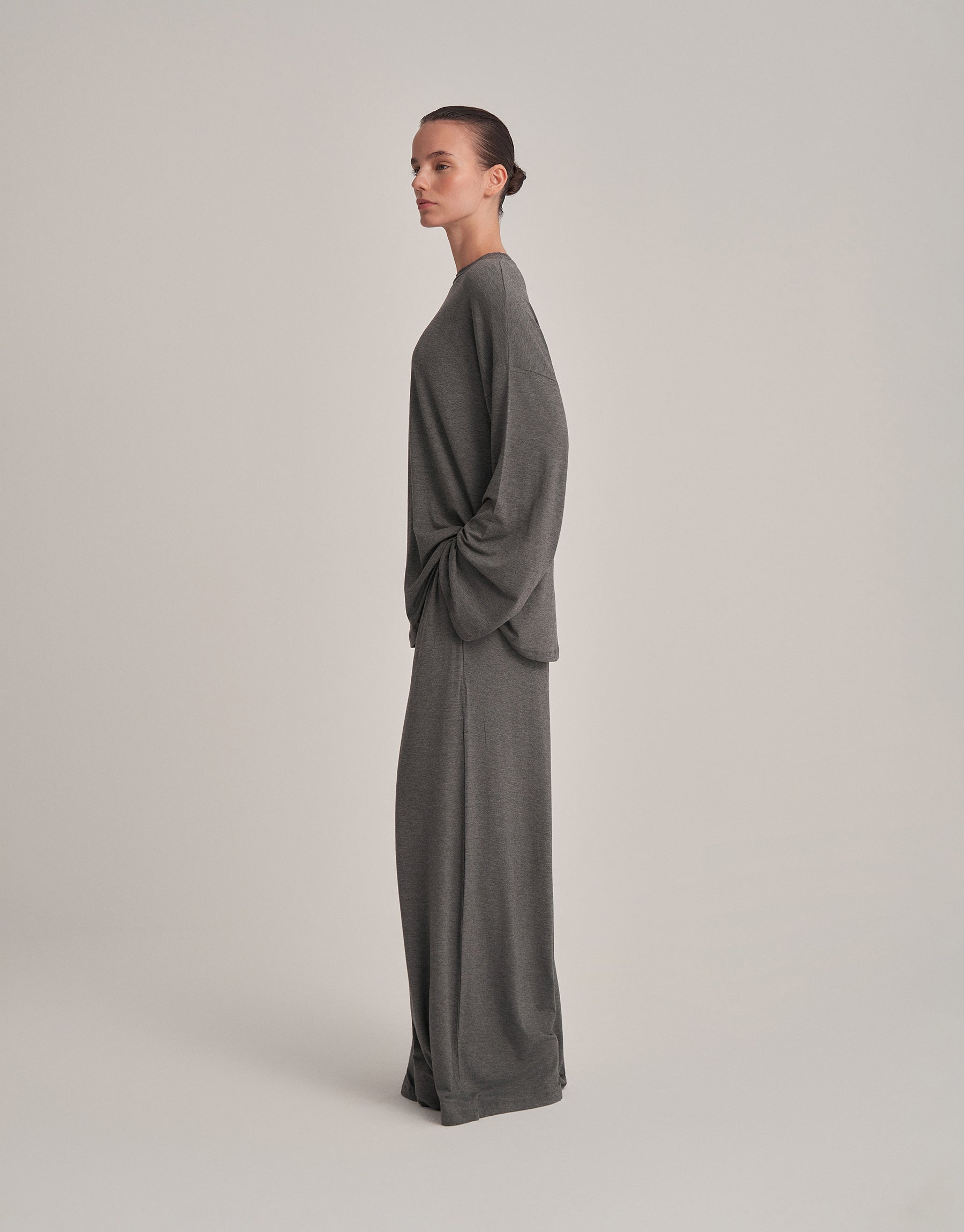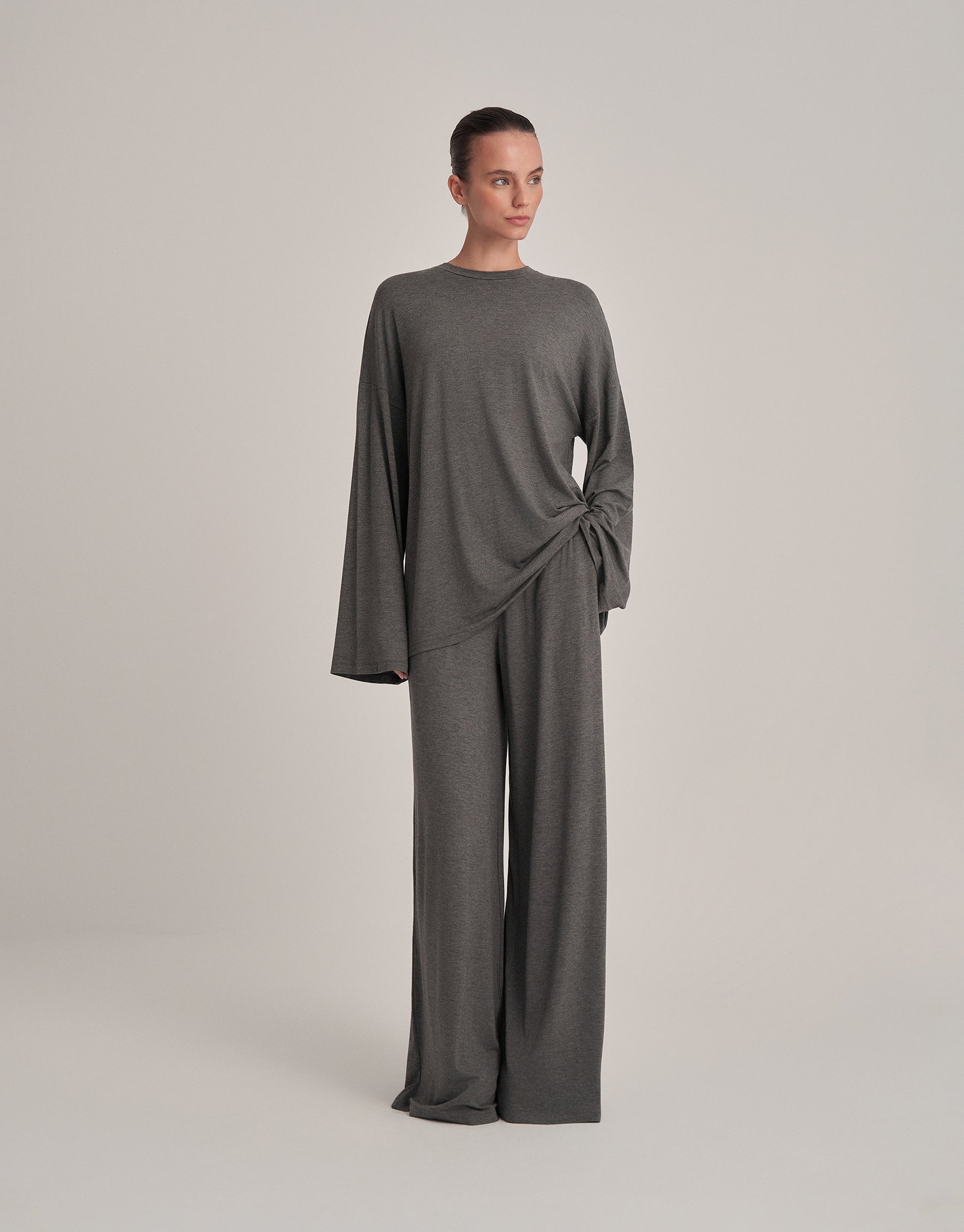 With its loose fit and flowing form, it offers elegant comfort without clinging to the body. The Spanish sleeve detail adds a touch of sophistication to its simple design. Its relaxed, figure-hugging look ensures all-day comfort. When worn as a set, it can create a classic look; you can also use it this way for stylish combinations.