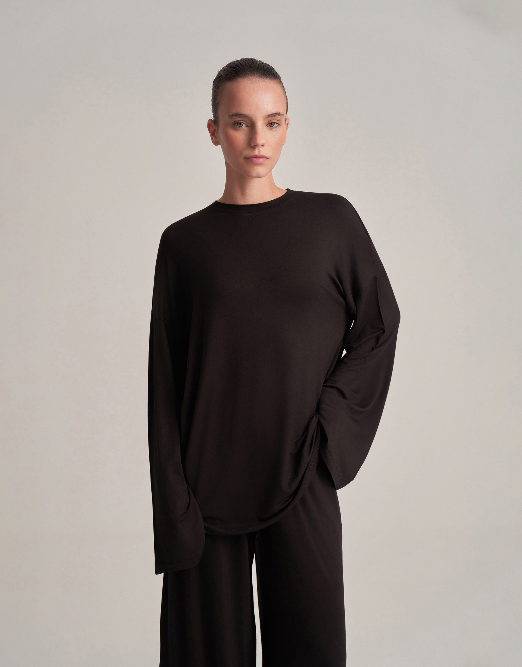 With its loose fit and flowing form, it offers elegant comfort without clinging to the body. The Spanish sleeve detail adds a touch of sophistication to its simple design. Its relaxed, figure-hugging look ensures all-day comfort. When worn as a set, it can create a classic look; you can also use it this way for stylish combinations.