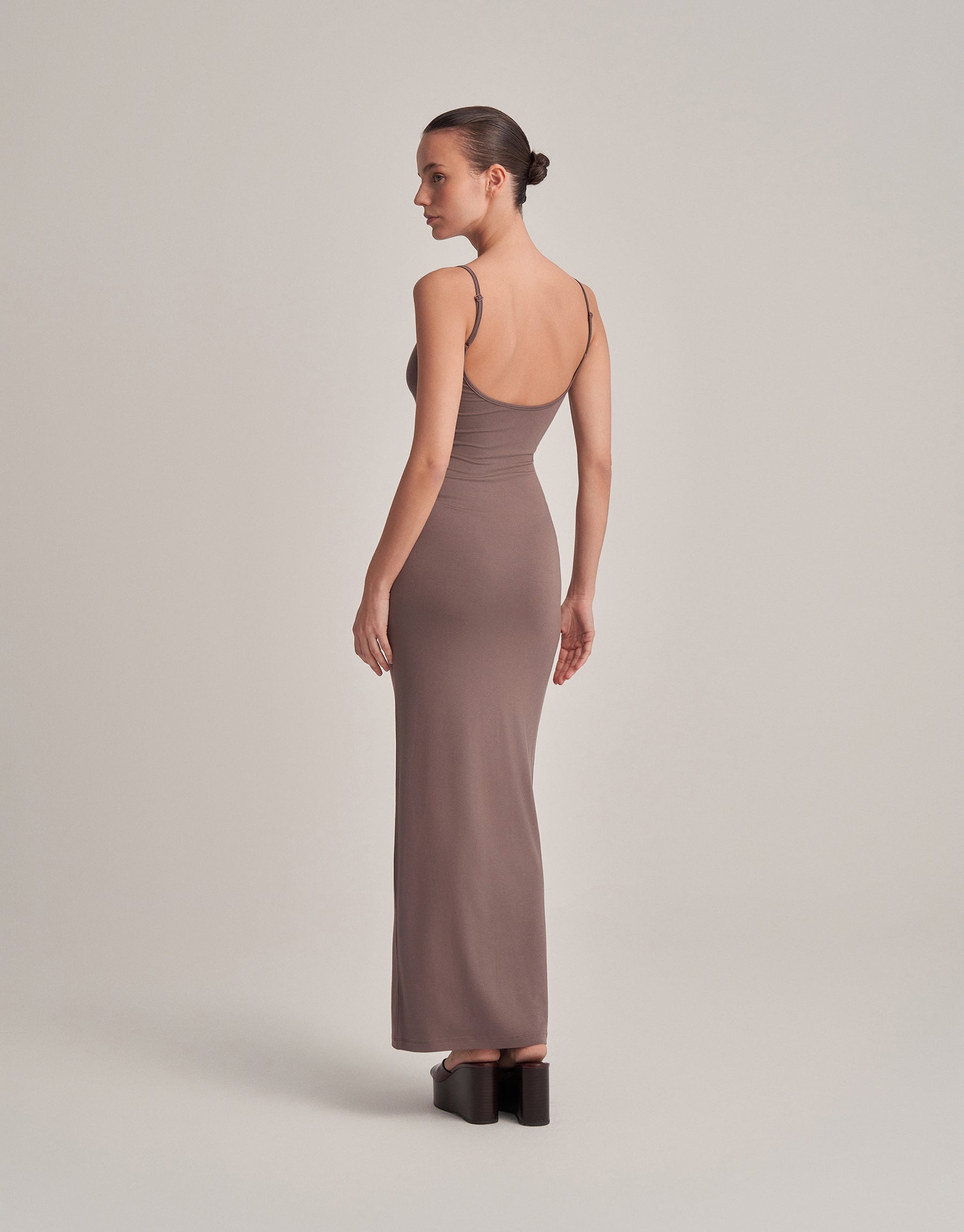 BACKLESS, STRAPLESS LONG DRESS, DARK MINK