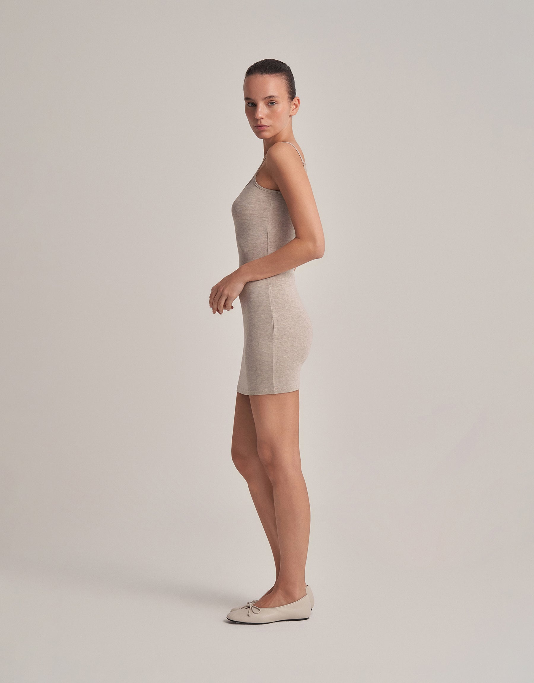 This mini dress offers a calm and simple look, and its soft texture provides all-day comfort. It adds an elegant touch to everyday style; it can be easily worn at home or in the city. You can create a contrasting balance by combining it with short kimonos, or achieve a modern simplicity on its own.