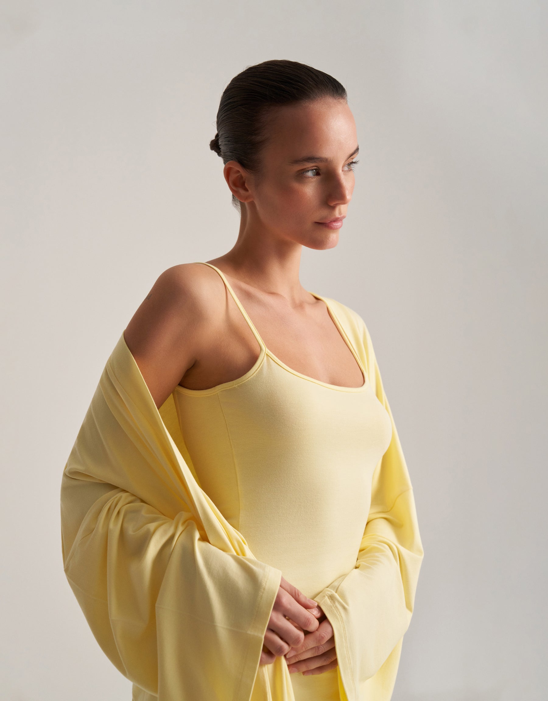 This mini dress offers a calm and simple look, and its soft texture provides all-day comfort. It adds an elegant touch to everyday style; it can be easily worn at home or in the city. You can create a contrasting balance by combining it with short kimonos, or achieve a modern simplicity on its own.