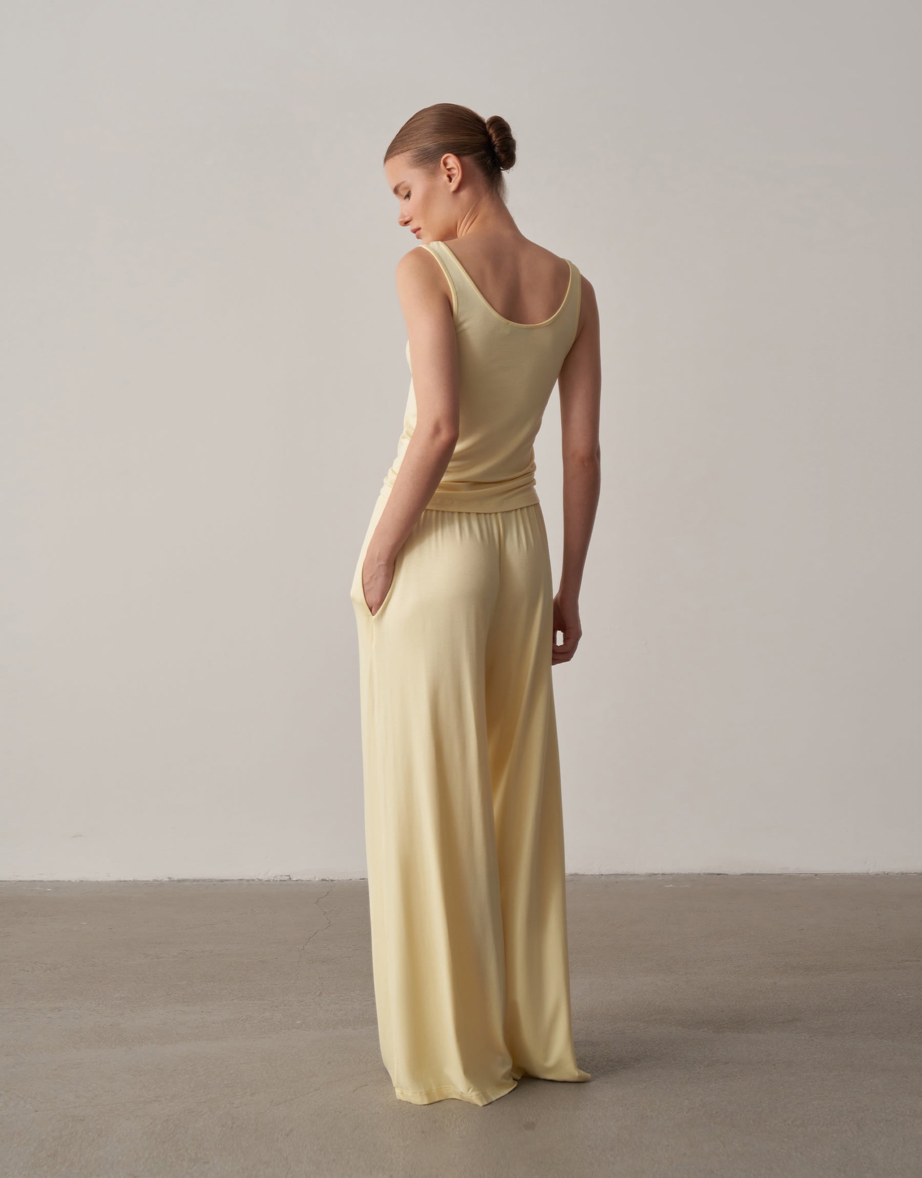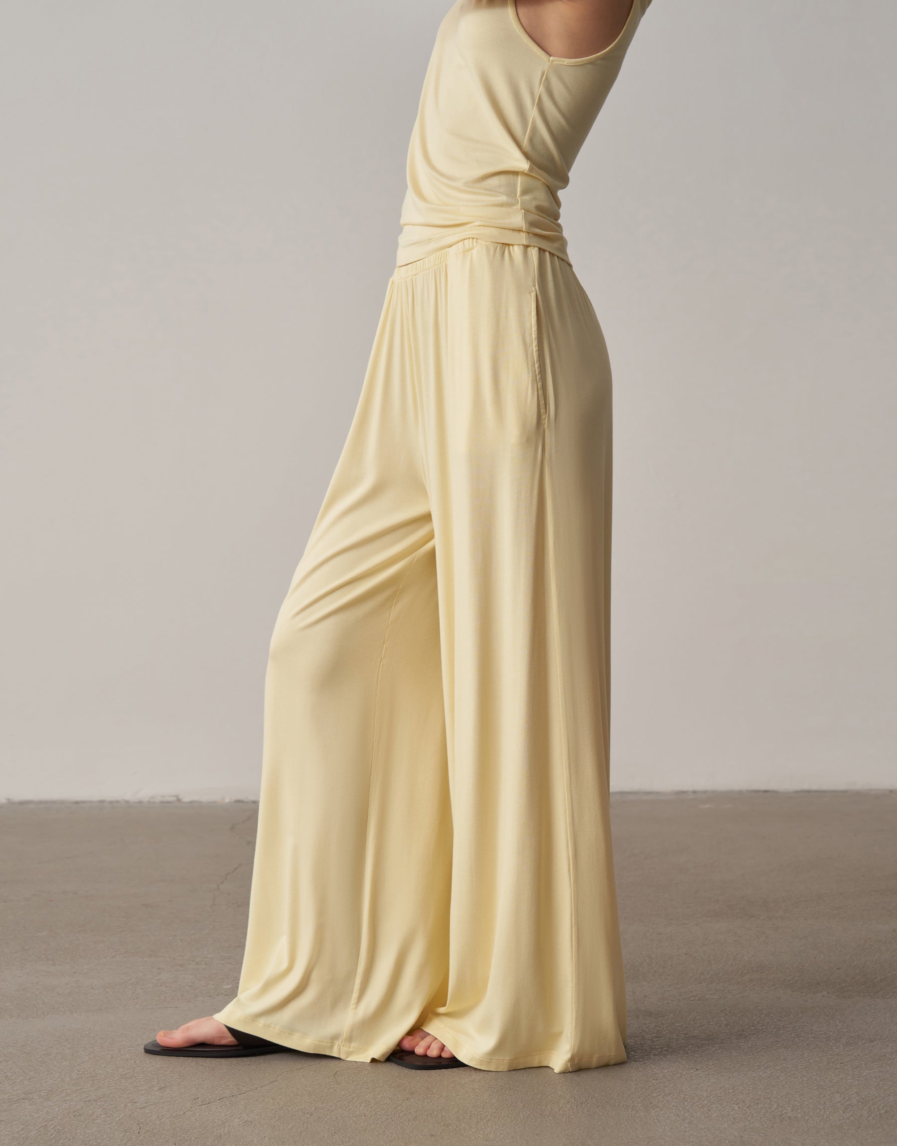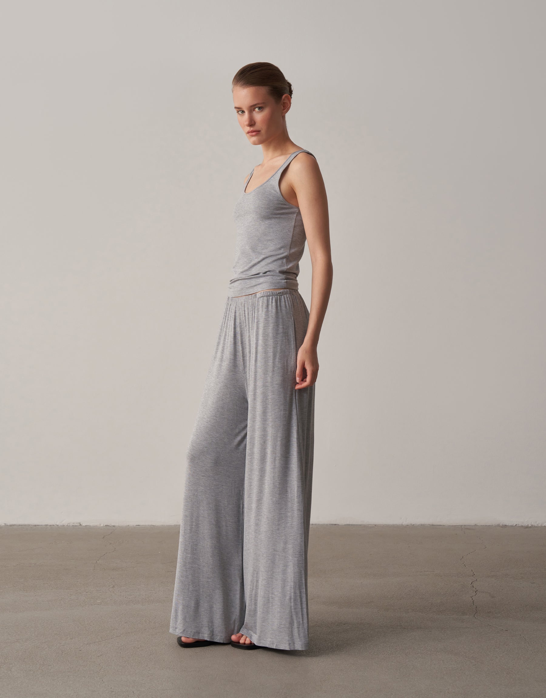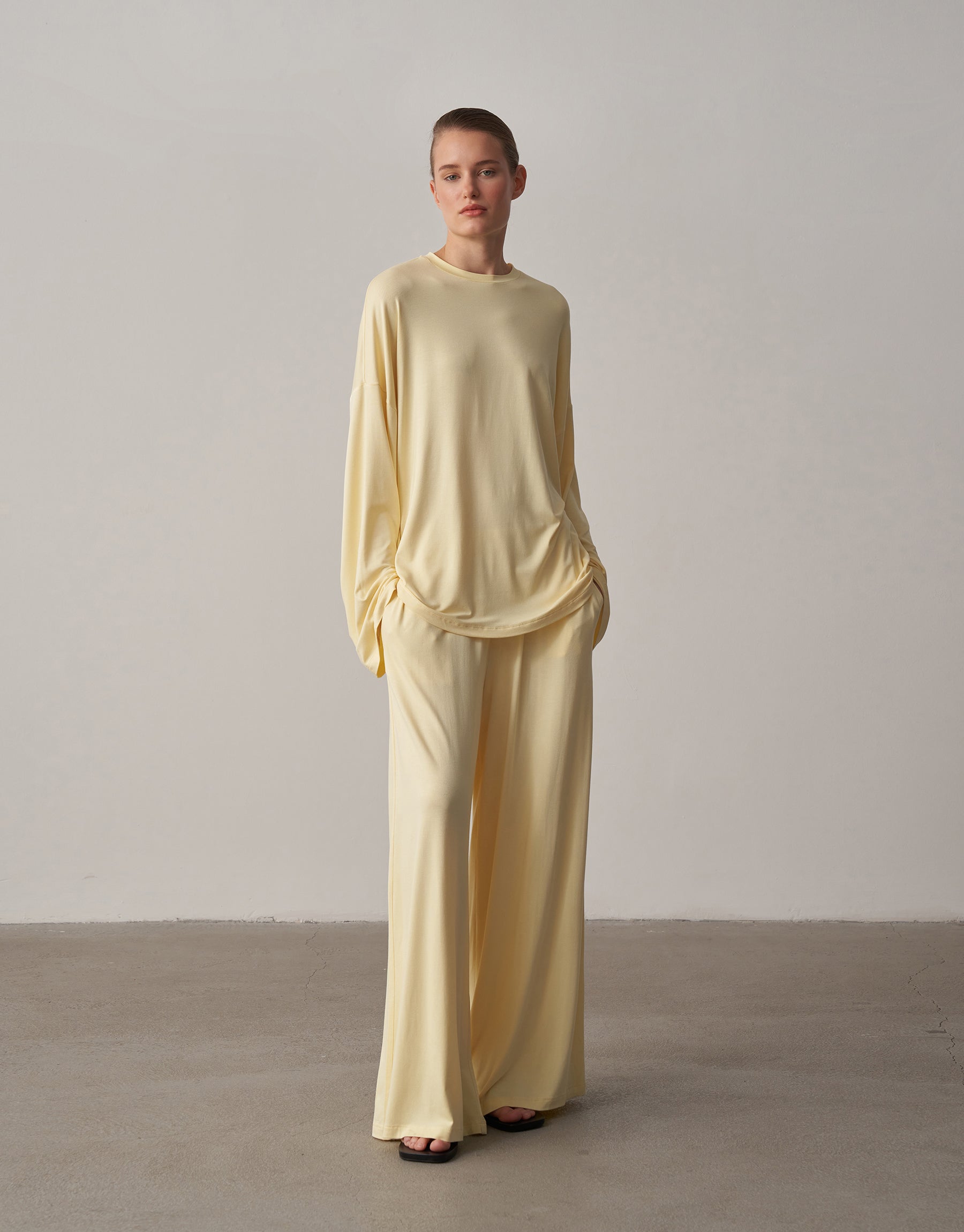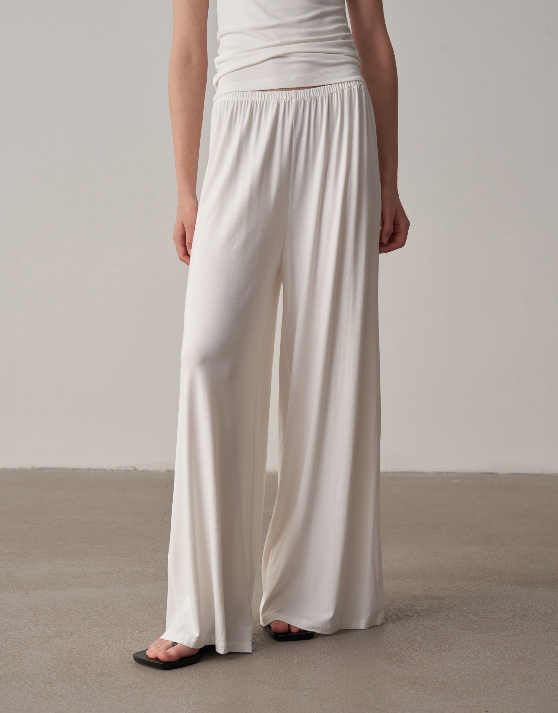 Günün ritmine uyum sağlayan, geniş ve rahat pantolon. Yumuşak dokulu, nefes alan kumaşı cilde naziktir. Akışkan formu adımları hafifletir. Elastik bel bandı nazikçe kavrar, iz yapmaz. Geniş paça kesimi temiz ve modern bir silüet sunar. Evde konforlu, dışarıda şık kullanım sağlar.